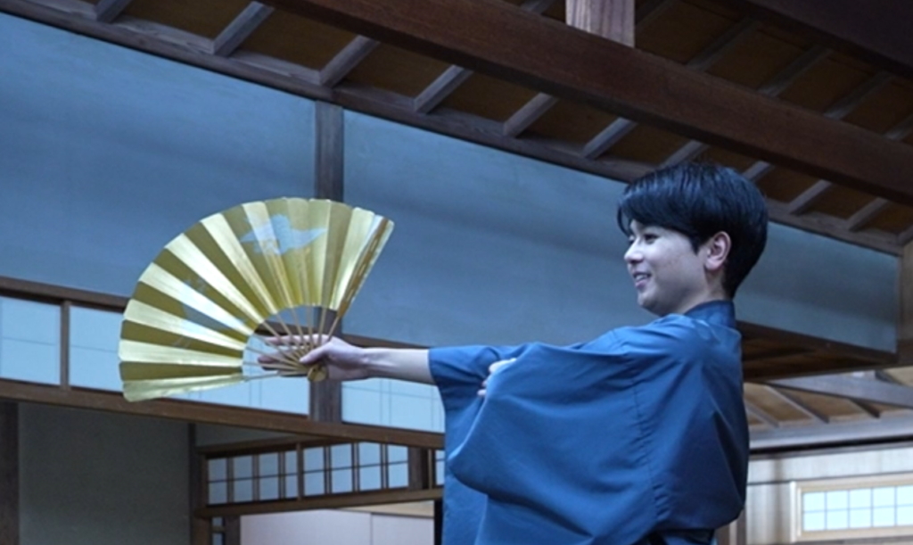 「雲ノ扇(くものおうぎ)」は、扇を返しながら大きく広げる動作です。左足を引きながら体から扇を遠ざけ、空間を広く使います。このとき、扇の一番下の骨と小指が添い、腕までが一直線になる「かざし扇」の形を綺麗に整えることで、扇の柄が美しく映え、様式美が完成するのだそうです。細部に宿る美意識が、全体の印象を決めています。