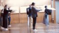 基本の「構え」から指導が始まりました。顔は真っ直ぐ正面を向き、上向きすぎると「照る(喜ぶ)」表情に、下向きすぎると「曇る(悲しむ)」表情になるため、中立を保ちます。両腕は肘を落とさず、大きな円を描くように空間を保持し、膝を軽く曲げて重心を落とします。