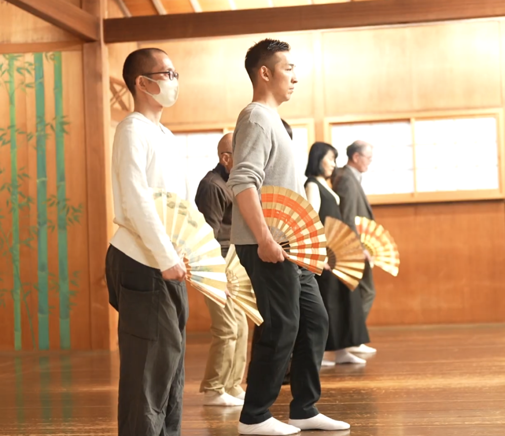 型の実践では、「サシコミ」「ヒラキ」「ネジル」「カケル」を順に体験しました。前方へ歩み寄りながら扇を体の中心に持ってくる「サシコミ」、そこから両腕を横にゆっくり広げながら後ろへ3歩下がる「ヒラキ」は、能における最も基本的な抽象表現です。「何かを意味するというわけではない」と志長は言いました。「ネジル」は足の裏全体を床につけたまま体の向きを変える動作、「かける」は軸足を残して外側へ足を回しながら方向転換する所作です。