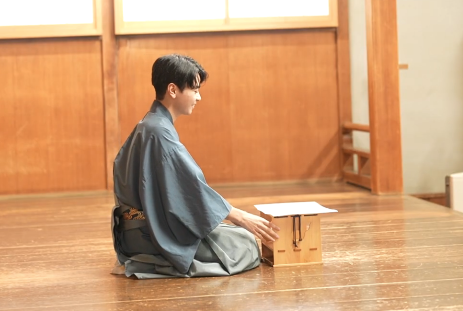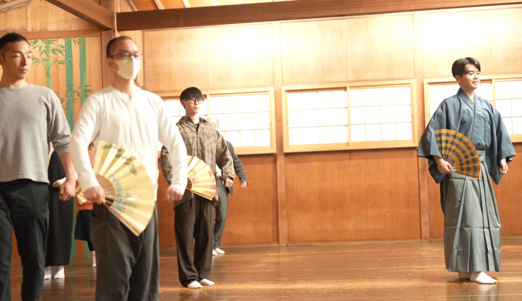 これは「夢幻能(むげんのう)」と呼ばれる形式です。世阿弥が生み出したこの様式では、歴史上の人物や縁のある者の亡霊が、現世に生きるワキの夢の中に現れて当時の思いを語ります。シテは能面をかけることで人間ならざる存在を表現しますが、ワキは決して面をかけません。ワキは「今ここにいる生きた人間」として物語を現実に引き留める役割を担っているからです。一方、「現在能(げんざいのう)」は物語が現在進行形で進む形式で、この場合シテも素顔(直面:ひためん)で演じます。「半蔀」は夢幻能の中でも特に優雅で静謐な曲とされており、今回の体験のテーマは「夕顔の優雅さ」を全身で表現することに置かれました。